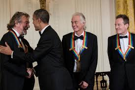 Carl’s email alerted me to Jimmy’s band, Led Zeppelin, appearing at Washington DC’s Kennedy Centre, as recipients of its annual award honouring exemplary achievements and contributions to American culture. In the video below, you’ll see Zeppelin’s three surviving members, Robert Plant, John Paul Jones and Jimmy Page, sitting a row from President and Michelle Obama. The Led Zepps are each wearing the rainbow-coloured sashes and medals presented at a White House ceremony hours earlier. The Zeppelin tribute, featuring Heart’s Ann and Nancy Wilson performing ‘Stairway to Heaven, was saved for last. Playing drums behind them was John Bonham’s son, Jason. Their performance brought stairway’s composers, Page and Plant, to tears.
