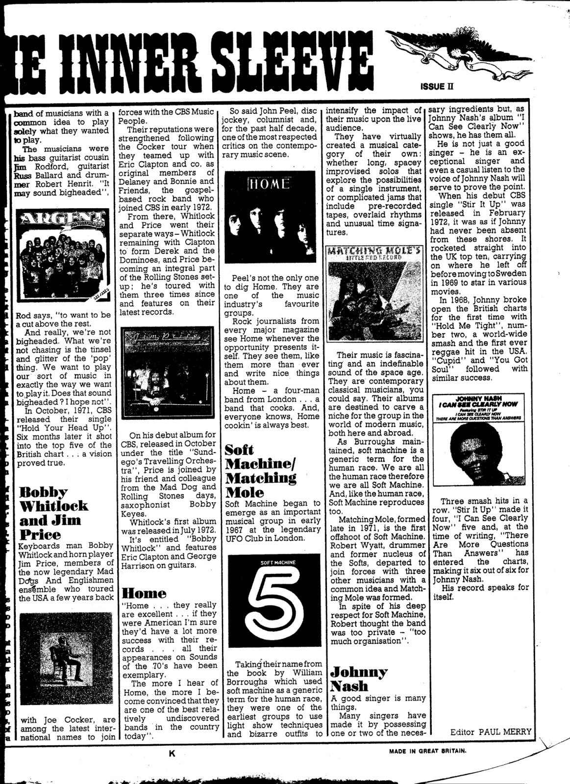 Some time ago, a lady in England tweeted me and asked if I was the author of The Inner Sleeve, a printed record sleeve that promoted CBS and Epic bands and artists. The Inner Sleeve was the name I gave to the paper record-sleeve enclosing our long-playing records. It sat inside the cardboard record covers, in Britain in the early 1970s, in the days before plastic inner sleeves. I replied that I was and heard no more about it.