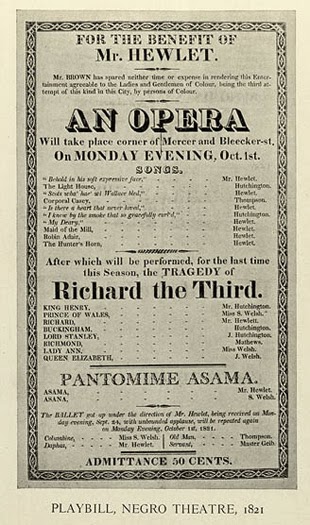 song in 1822 while the actor was giving a soliloquy from Hamlet. Pictured below (left) is a poster advertising that actor, James Hewlett, in Richard 111, a year earlier. While some reports say that Hewlett was an African American, others claim he was a mixed-race West Indian.